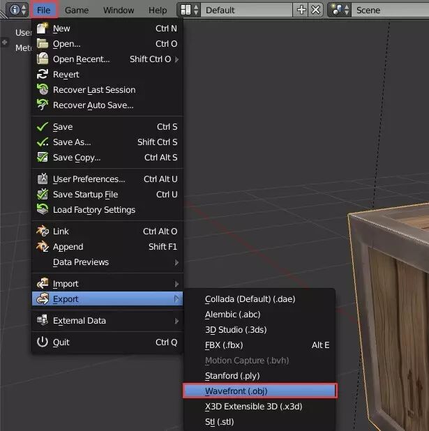 选中网格后,依次点击File > Export > Wavefront (.obj)导出为.obj格式,或选择FBX(.fbx)导出为.fbx格式: