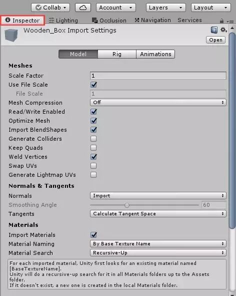选中刚才导入的网格,可以在检视视图(Inspector)中查看此网格的设置,也可以直接保留所有默认设置。