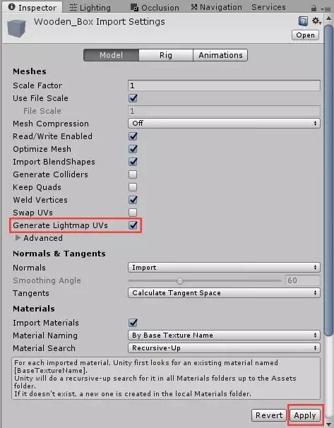 如果需要为网格烘焙光照贴图,而该网格又没有比较好的UV(重叠的UV就不太好)可用于烘焙光照贴图时,可以启用Generate Lightmap UVs来生成光照贴图UV。如果存在UV2通道,Unity将使用UV2作为光照贴图的纹理坐标。否则将使用主UV。Unity可以展开网格来自动生成光照贴图UV。只需启用Generate Lightmap UVs 选项即可。本例使用的立方体网格,带有为光照贴图烘焙准备的UV2,所以不需要启用Generate Lightmap UVs。