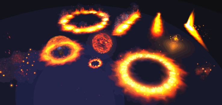 插件还针对所支持的平台提供了单独的示例场景,其中包含所有粒子特效的单独演示,还为每个特效提供了对应的音效。部分效果如下: