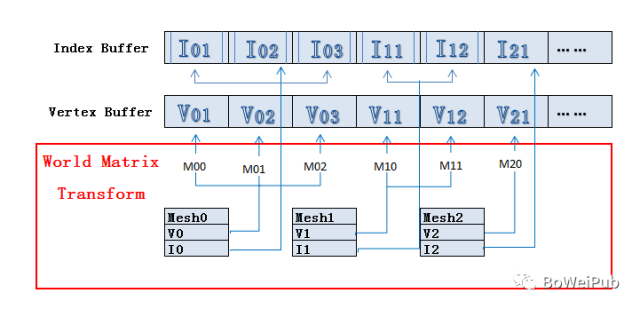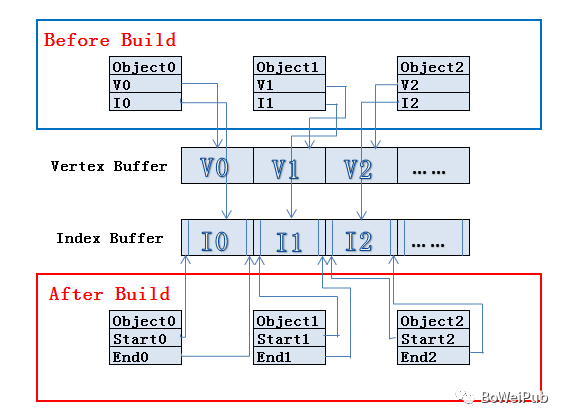 在Build的时候Unity会自动地提取这些共享材质的静态模型的Vertex buffer和Index buffer。根据其摆放在场景中的位置等最终状态信息,将这些模型的顶点数据变换到世界空间下,存储在新构建的大Vertex buffer和Index buffer中。并且记录每一个子模型的Index buffer数据在构建的大Index buffer中的起始及结束位置。