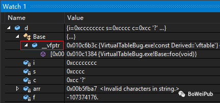 上图中可以看到在对象的内存区域的头部有一个名为“_vfptr”的变量,这就是传说中的虚函数表指针,也就是这次bug的元凶。