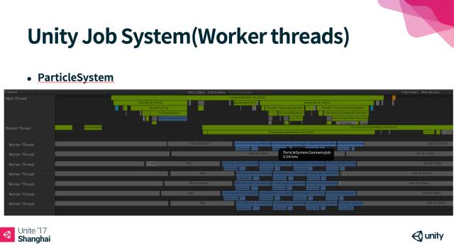 Unity会致力于把一些计算量比较重的系统挪到其他的工作线程上去,例如粒子系统、动画系统、布料计算、遮挡剔除、视锥体剔除、蒙皮和静态裁剪等等。Unity Job System就是为了更好地让这些底层系统能够在多线程下安全高效的并行运作。也就是我们经常在Profiler底下看到的多个Worker Threads。