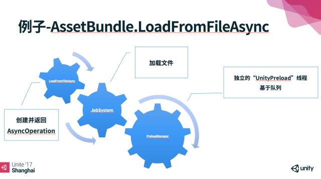 上图的示例中,调用AssetBundle.LoadFromFileAsync时马上创建一个AsyncOperation,然后马上交由Job System去处理文件的IO相关操作,等Job System处理完之后就交由PreloadManager去处理Asset Bundle的加载相关操作,而PreloadManager就是叫“UnityPreload”的独立加载线程,而且它是基于队列式的加载管理。