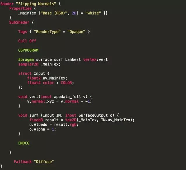 由于需要看到球体内部才能观看投射的全景视频,所以接下来要将球体法线进行翻转。在Unity中,球体并非数学意义上的真正球体,而是由大量小的平面拼接而成的多面体。球体外部可见但内部不可见,所以需要使用着色器来翻转这些小平面。