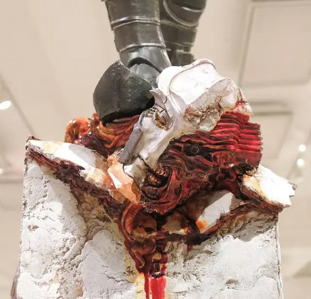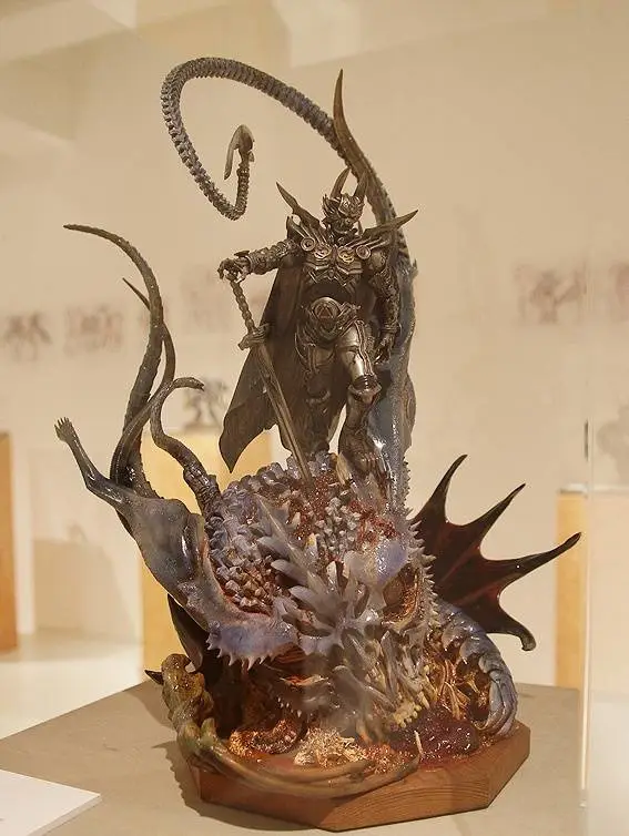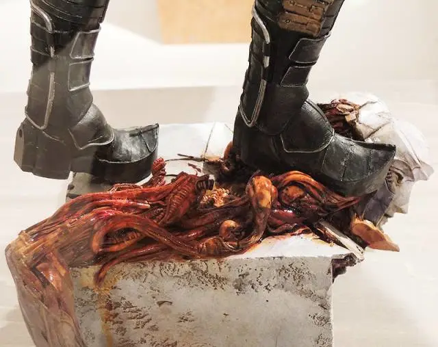 异形堆底部由5-6只匍匐的异形组成,一只异形跪坐其上,两手合放在两腿中间,一根尾巴从下方异形堆中伸出,造型震撼,一种黑暗魔幻的压迫感直击心灵。
