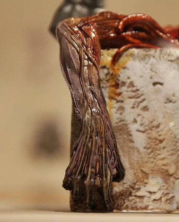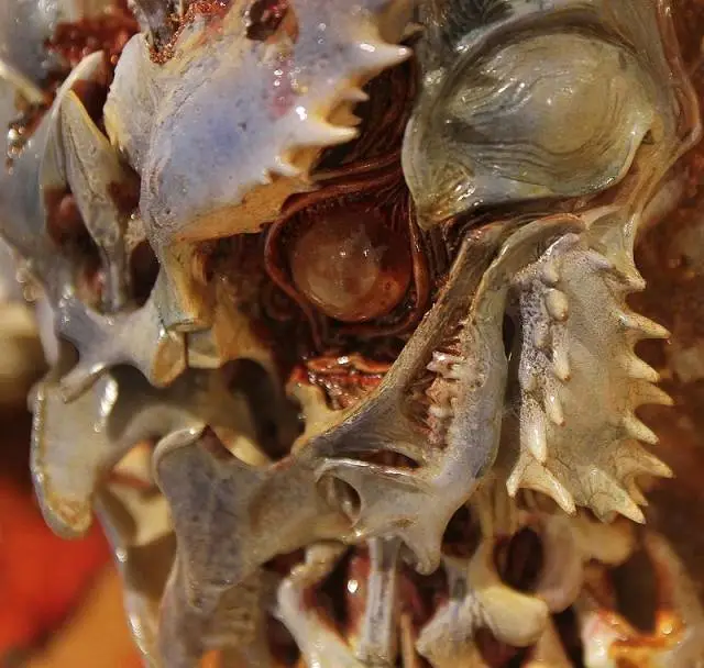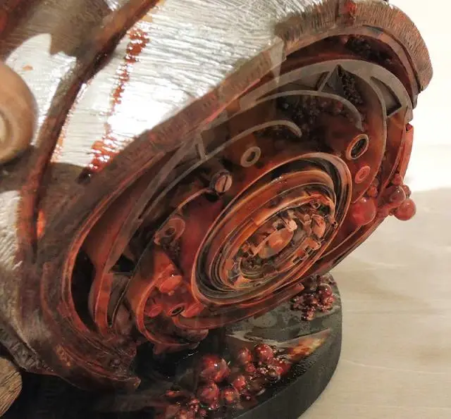 当我们仔细观察竹谷隆之的作品,会发现他偏好用生物作为素材,比如昆虫或者甲壳纲的海洋生物。另外,在他的一篇采访中曾经提到,鲨鱼牙齿也是他很喜欢的素材。“我很喜欢它主要是因为当你把它们按顺序排列起来的时候,它们是逐渐从小到大的——要知道一个一个制作同样形状但是不同大小的零件是一件非常让人头疼 的事情。(笑)还有就是我也非常喜欢鲨鱼牙齿那与众不同的形状。”此外他还会用到漂流木,有时甚至不加任何改造地使用。