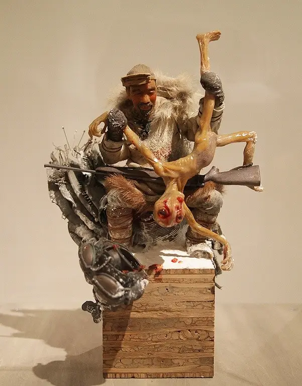 他回答:“不管我怎样努力,都没有办法让我的作品看起来能愉快一些,呵呵,我的父亲是一个渔民,但是他也会在冬季打猎,他会设下圈套去捕捉狸和狐狸,我时常看他拔它们的皮,在我的生活中那是很平常的部分。