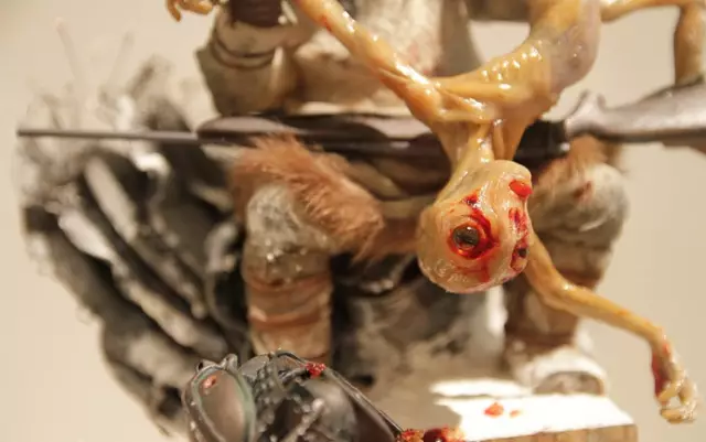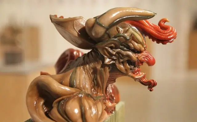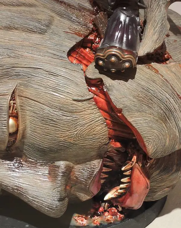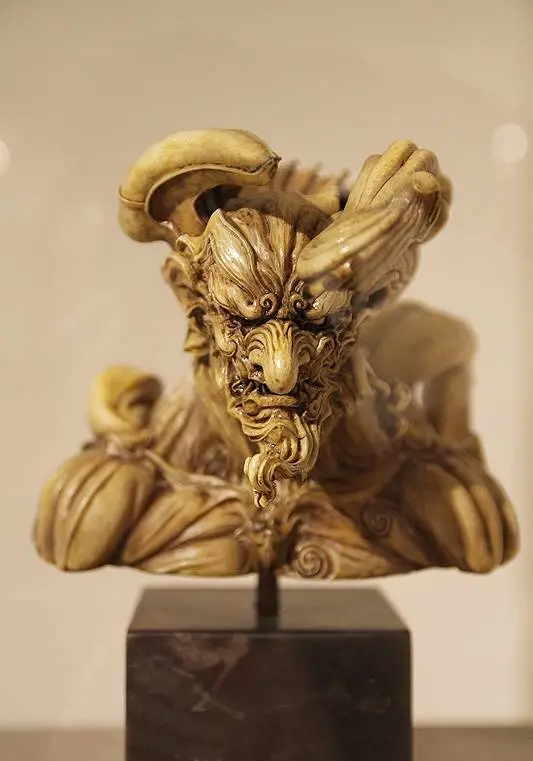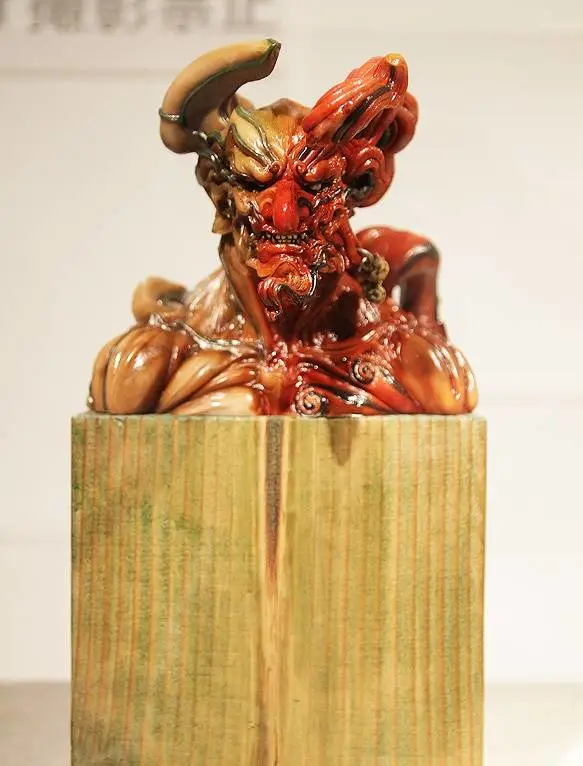 我们再来看看角色格斗游戏领域的《铁拳》中的著名角色吉光,同样地,竹谷在创作中注入了自己的想法和感受。底部木质肌理形成天然的皮肤纹路,眼、口、颈部内部的涂装质感非常到位。从手法方面分析,和黑魔一样,在吉光的整体设计上,竹谷从材质、色彩或体感方面拉大了上下的反差和对比,更加鲜明地表达了角色特质。