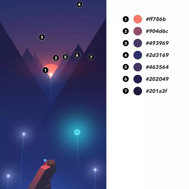 将手机中数张《纪念碑谷2》截图挑选出来一些经典场景,为大家提取了一些配色卡和色号,方便还没玩到的安卓手机设计师用户了解和取用。