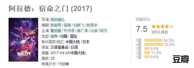 目前看来,作品口碑不错。腾讯视频、乐视视频和爱奇艺的用户评分均超过9分。豆瓣评分为7.5分,近七成用户给出了四星及五星的评价。