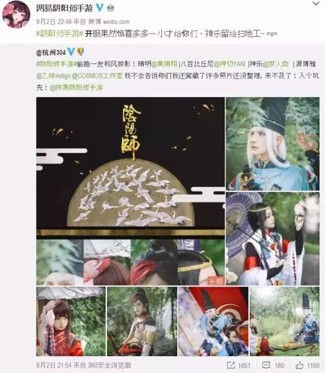此外,阴阳师也很好地把握住了二次元圈内的KOL自带的宣传效果,与各个大触,无论是B站up主还是微博coser都保持着很好的联系。(阴阳师究竟是主动邀请了这些大大来宣传阴阳师,还是在各位大大有相关产出后及时进行了跟进和互动,不做揣测。)例如下图为知名cos团队杭州304的阴阳师相关cosplay,在9月2号App Store上线日同步放出。我们可以看到,这条微博也收获了不错的传播量。