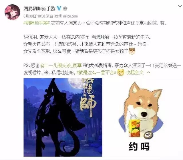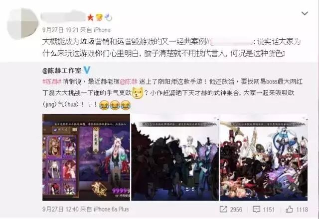 在这种情形之下,阴阳师的运营也出过昏招——为游戏选择了一位虽然大众但是在二次元圈内并不受认同的代言人。这其实是阴阳师对产品目标人群定位的一次摇摆。随后在玩家的狂喷下,阴阳师官微删除了与陈赫工作室的互动。(截图没截到阴阳师官微的互动部分,大致就是欢迎新代言人嘛。)
