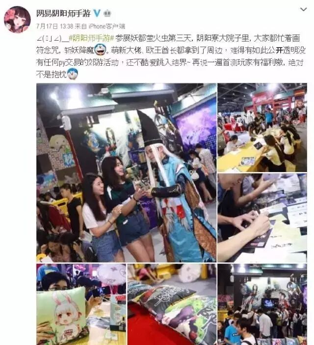 在地推方面,阴阳师精确地定位了漫展这块二次元人群的线下聚集地。在各大漫展上都能够看见阴阳师的身影,例如下图,早在内测时期,阴阳师就在7月17号广州萤火虫漫展上进行了宣传预热。