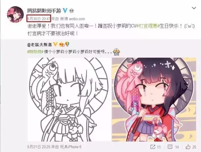 对于二次元圈内广大的二次内容生产者(即同人创作者),阴阳师官方也给予了积极的用户互动与维系。甚至,阴阳师官方一直在不断发掘话题点,鼓励UGC 内容的生产。官方微博几乎一半的内容都是转发粉丝的二次内容产出,并且,这一调性在从官方微博设立之初就已经确立,官方发出的第三条微博就是转发了一幅内测用户绘制的同人图。