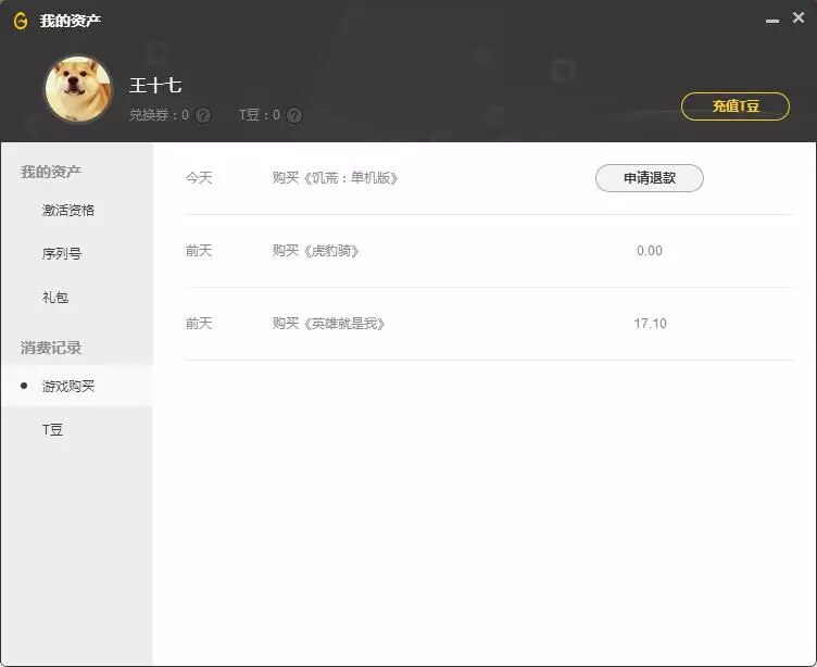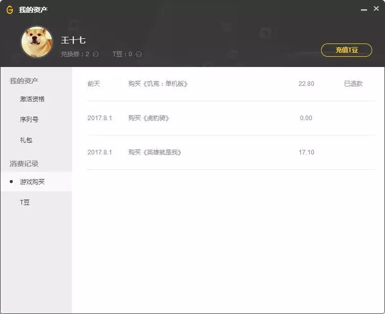 通过“我的资产”,能够看到用户当前拥有的虚拟资产,包括虚拟货币“T豆”、兑换券、激活资格、序列号以及礼包等。另外也可以查看购买记录。