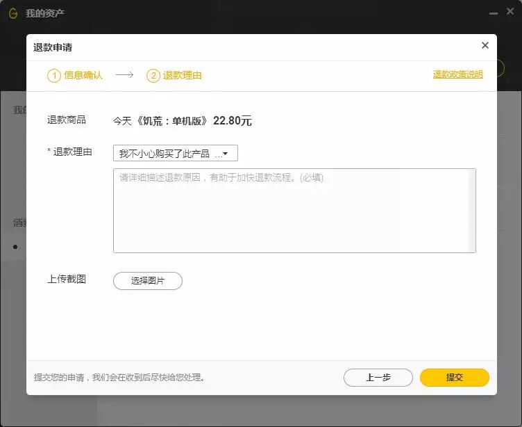 点击“退款”按钮就能够进入“我的资产”界面,其中会显示玩家的游戏购买记录,玩家可以在这里申请退款。