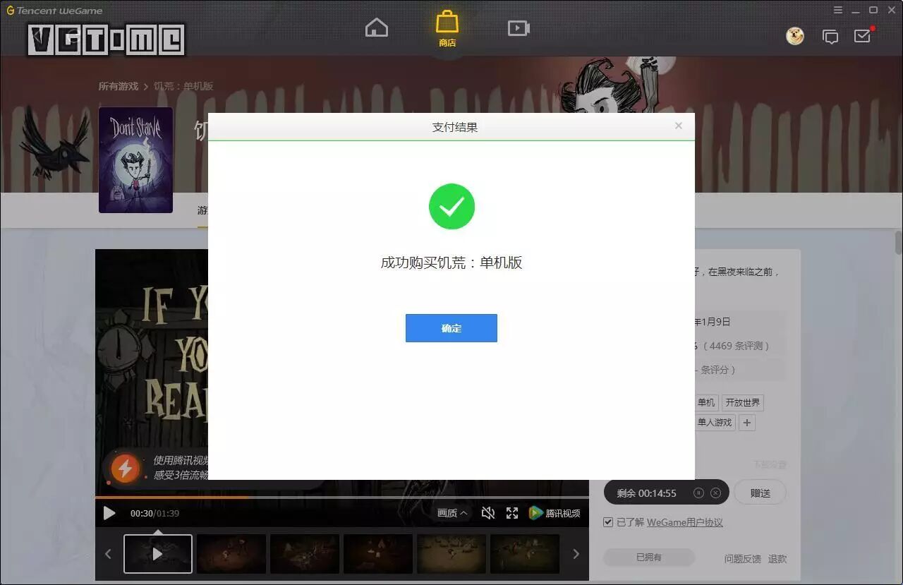 我们之前尝试了用微信支付的方式购买《饥荒:单机版》,在扫码并支付后,WeGame会立即提示购买完成,并开始下载。