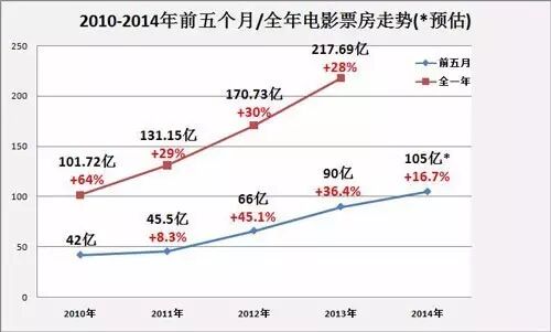 2010年全年电影票房101.72亿;而2014年只用了141天。并且全国平均每天增加15块银幕,