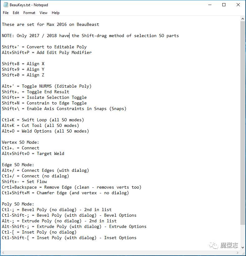 对于一个艺术家来说,不要把时间浪费在他们每天都要做的事情上是很重要的。(咦,这不就是工作么)如果需要,花时间查找或自己写一些脚本和工具,帮助你摆脱老是点鼠标啊点鼠标。对我来说,当我花很多时间建模时,我就会给我经常使用的工具编写键盘快捷键,这样我就可以练习它们了。自从我用左手用鼠标以来,我就决定得重新写一下快捷键来适合我的右手。(中国的左撇子不多啊)每次我在3dsmax建模的时候,我得打开这个快捷键清单。。。(看来记性不大好)