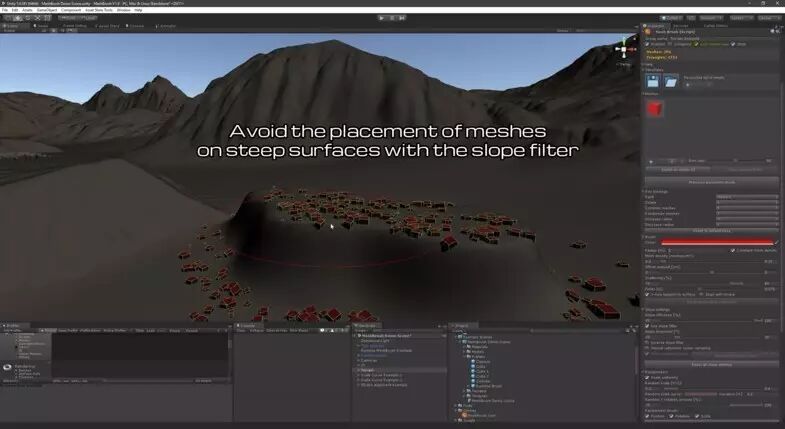 MeshBrush插件用于在游戏对象表面绘制网格,可以直接改变场景的整体外观。MeshBrush支持定义多个网格进行绘制,并设置其缩放、旋转及位移,根据实际生成动态改变网格大小,而无需更改原始的预制件。MeshBrush支持在绘制完成后一键对网格进行自动合并,以优化整个场景的性能。另外,还可以将设定好的画刷保存为配置文件,共享给团队成员,以提高团队协作效率。