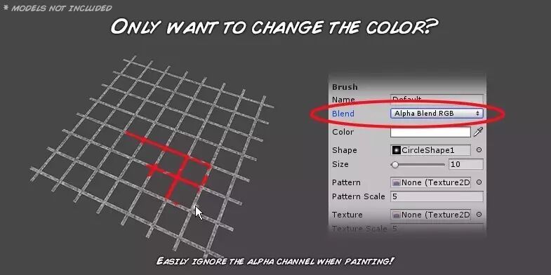 Paint in 3D支持在编辑器及运行模式下对带有动画的蒙皮网格进行绘制,还可以设置画刷与模型的混合模式,支持Alpha混合、叠加、相交及法线混合等。可以自定义画刷的大量属性,包括大小、旋转、透明度及自定义形状等。