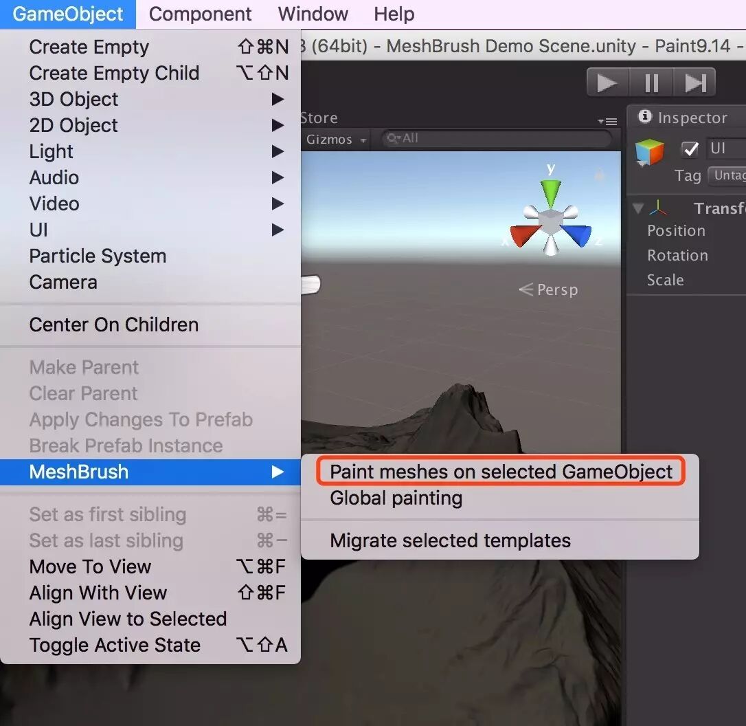 使用MeshBrush也很简单,首先在层级窗口选中需要进行绘制的游戏对象,然后依次点击菜单项GameObject – MeshBrush – Paint meshs on selected GameObject,插件会为游戏对象添加MeshBrush组件,并询问是否添加网格碰撞器。
