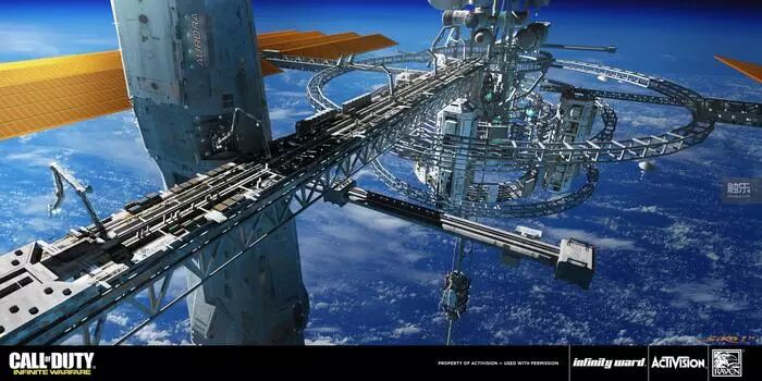 《使命召唤13:无限战争》就有这么段内容,向玩家呈现了强攻太空电梯的场面,游戏中要求消灭位于火星船坞太空电梯的守备部队。原本以为在关键的战略枢纽和剧情折点,必然有重兵把守,结果干掉少量士兵和机器人就草草收场,接着便进入上层太空船坞,一些室内战斗后,最后为摧毁太空船坞,主角大吼:“向我开炮!”……