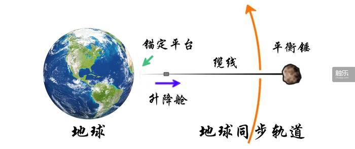利用这一原理所建造的天梯,大致由四部分组成,首先是顶端部分,即围绕地球同步旋转,距海平面约3.6万公里高空的平衡锤。其次是底端部分,在地球的锚定平台。然后是中间用以连接两者的缆线。最后是用作输送物资人员的升降舱。看起来很像电梯?是的,就是某种尺寸更大的电梯……