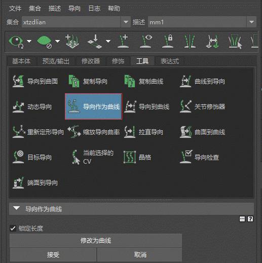 10.如果我想修改引导线的方向,我需要在工具架上找到”雕刻笔刷”.或者在工具里点击”导向作为曲线”把导线修改为曲线,去修改曲线的点,来调整你的造型.
