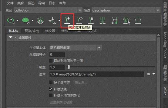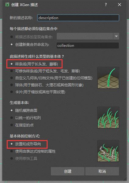 3.创建XGEN描述选项,顾名思义,新的描述名称可理解为是你这个毛发的子对象,而新合计理解为是父对象,相当于合集是一个Group.其他的选项大家可以自己去试试,这里我们使用样条线,和放置和成形导向的控制方式
