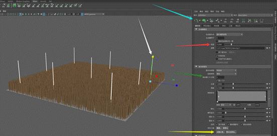 6.选择白色指针的引导线,缩放旋转可以更改毛发的长度以及方向,选择天蓝色指针的眼睛图标按钮是刷新修饰体,红色箭头的地方是毛发的密度,绿色CV计数就是修改引导线的段数,黄色箭头是修改引导线的长度,其实缩放也可以,这俩我都用.其他的属性,宽度什么的,自己理解就好了.