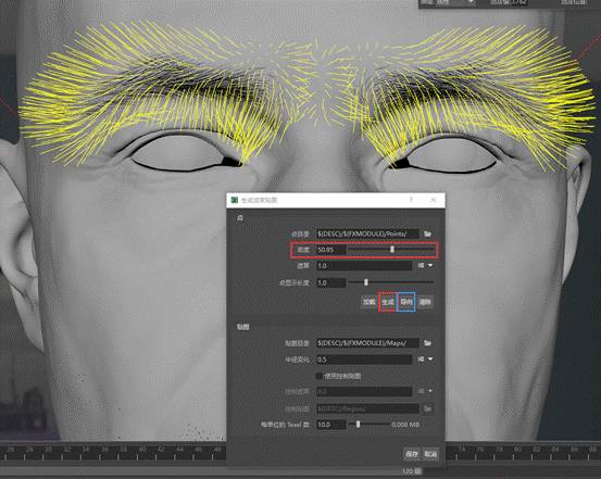 22.现在全选引导线,在xgen工具架上点击倒数第四个镜像复制引导线.这时候另一边的引导线是有了,这时候mask还是没有画的,需要重新画一下,maya自带的3dpaint有镜像绘制的功能,但是我没有使用,因为模型也不是完全镜像的,还是有偏差的(其实偏差不了多少,几乎可以忽略不计)另外就是我看到俩眉毛一摸一样的我就浑身蓝瘦!(别找借口,忘开了就是忘开了.)