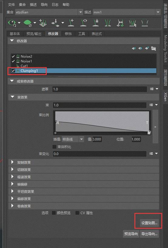 24.我在修改器这里加了几个修改造型的节点,Noise2和Noise1是我之前添加的.数值很小,我要的就是这么微妙的效果(这里我要吐槽一点,有的人为了添加细节而去疯狂的添加细节,把noise参数给到很高,恐怕别人不知道你加了noise结点似的,在你拥有参考并还原的情况下,适当的添加修改没问题,就怕陷入细节盲区,全是细节都等于没有细节)我们点击下面的设置贴图来进行clumping的修改