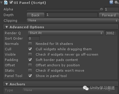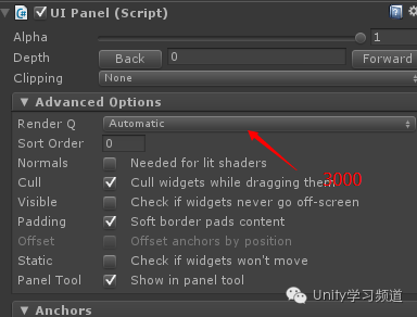 NGUI中,常用的UIPanel等都有自己的渲染层级,进入UIPanel.cs脚本查看源码,我们会发现它默认的渲染层级是3000