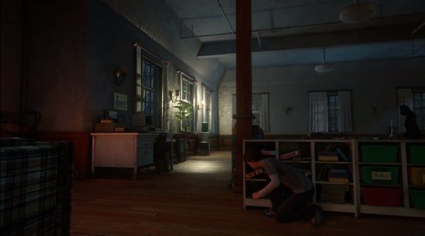 这是玩家很前期的一个场景,玩家操作主角要离开房间。在光线相对昏暗的房间里,其中一个窗口旁边有灯亮着,这时候玩家不用思考也知道要往那边去了。