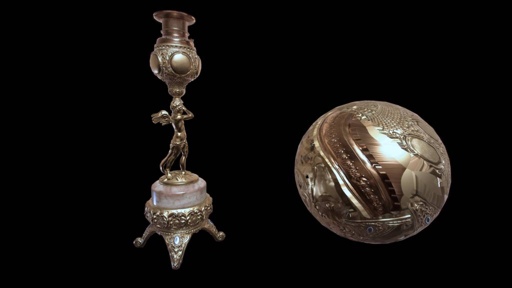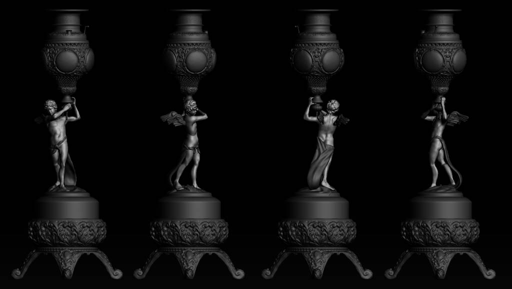 然后使用ZBrush创建了柱体并使用对称工具雕刻出了大体的形状。这里为什么没有使用alphas(阿尔法)或者Polygon建模,主要原因是想避免创建完美的形状,可以让灯有手工制作的感觉。大家可以通过在一个平面上进行雕刻所获得的高度图,将其应用到小细节的雕刻上。然后重建Polygon,生成UV,随后导入Substance Painter制作纹理贴图,最终导入到Unity。