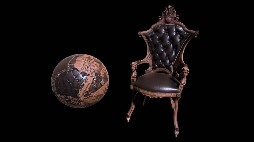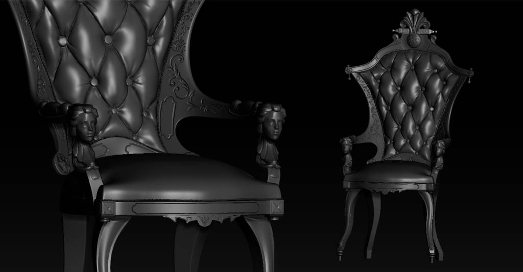 在Maya中用Polygon制作了低模,并将低模放到了ZBrush中雕琢细节。然后剔除网格且将它放回到Maya中修复那些错误的多边形。开始为椅子模型制作了UV并放到了Substance Painter中制作纹理,最后将模型输出到Unity引擎中。如下图所示: