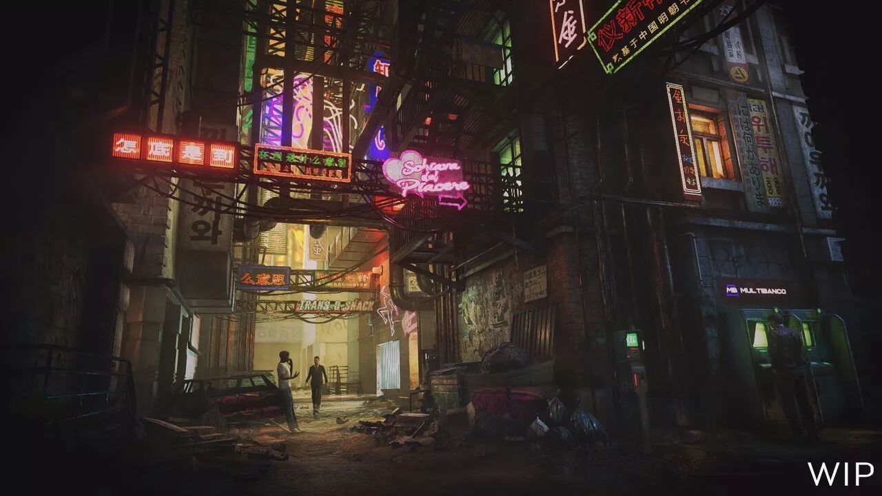 霓虹灯牌匾使用了带有alpha通道的emission贴图,同时没有开启mipmap,这样可以显著地减少马赛克效果,尤其是在远处的霓虹灯牌匾。其次,一个能显著提升环境档次的是硬边上的倒角。在光线开始影响这些倒角之后,画面的质量就会显著地上升一个档次。