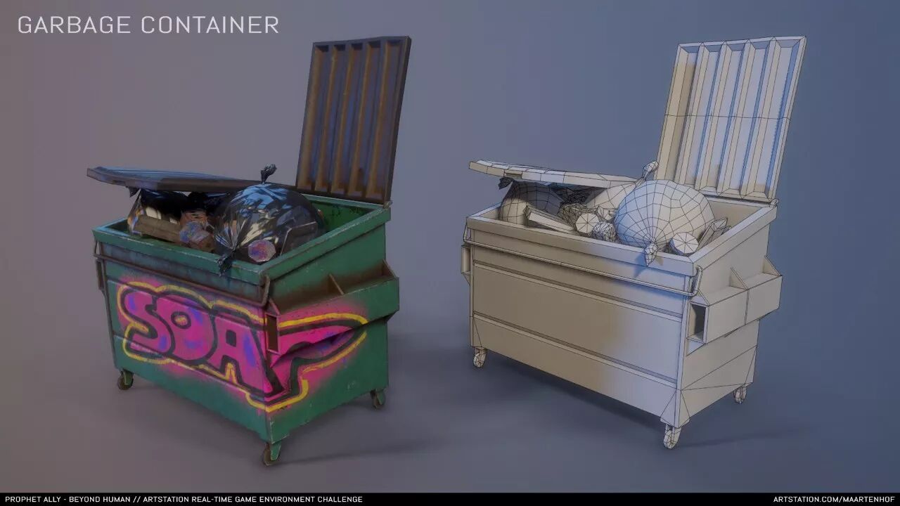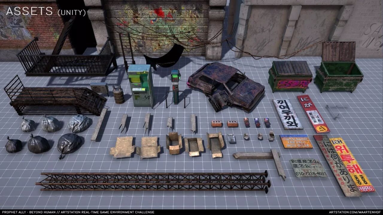 Maarten Hof的Blender场景和Unity场景实际上是通过一个为“blockout”的fbx文件同步的。开始是用它做场景草稿的,但后来渐渐地把所有的东西都做在了这个场景里。通过这种方式,可以直接把模型建在正确的地方(场景最终稿中的位置)。决定了模型最终样子后,需要对模型进行清理操作,然后设定好坐标轴并导出到Unity。在Unity中将所有单独的模型组织好,比如各种容器、ATM、垃圾等。在设定好位置后再做一个高模,并为其做好UV并做好贴图。