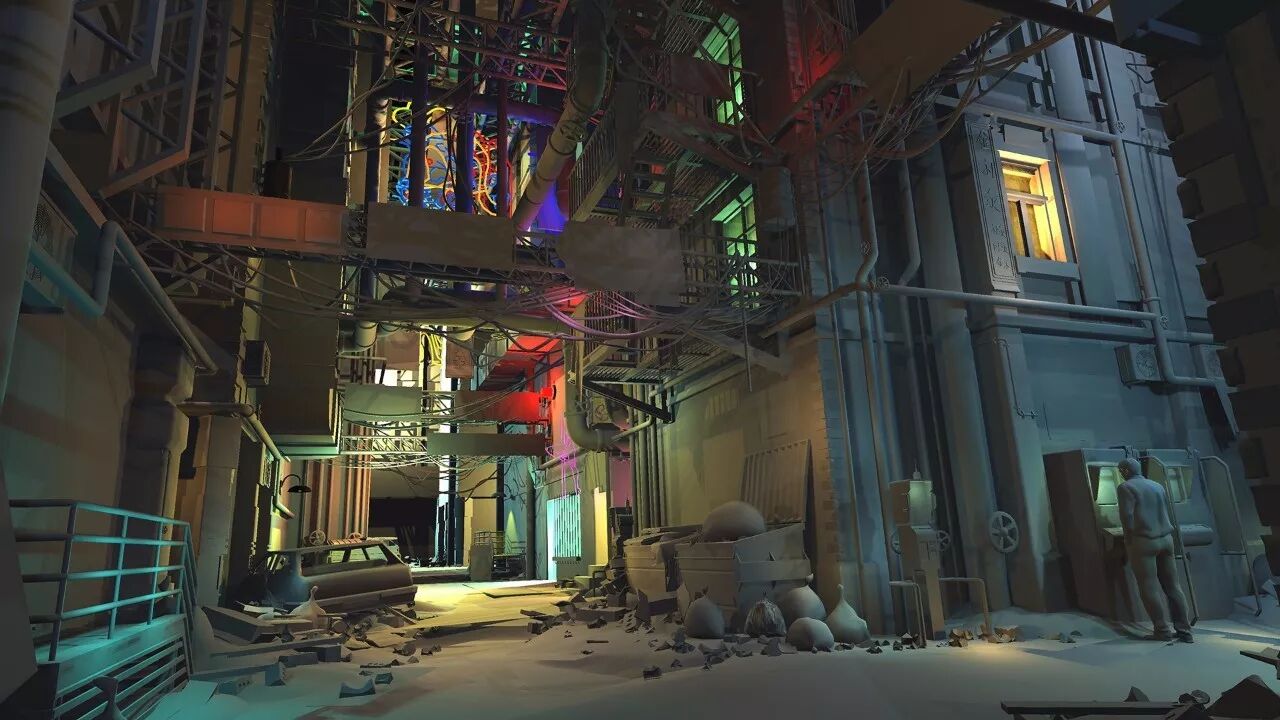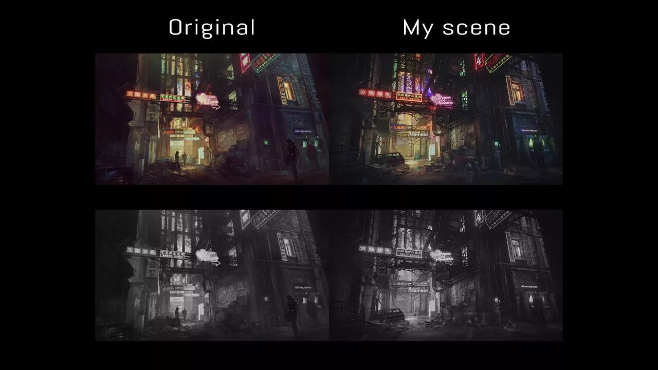 如果大家对3D环境的光照非常感兴趣,可以把这看作是一次挑战自我的机会,提升自己在用光方面的水平。需要大家仔细研究概念图中各种颜色的细微差别,可以尝试在Unity中模仿。每当在场景中添加一个新道具时就需要重新调整光照。这里与大家分享一个小技巧就是在Photoshop中大幅提升概念图的颜色饱和度,以便更清楚地分辨出颜色之间的差别,同时也更容易找到光线反射的方式。之后为了方便检查模仿结果,可以制作场景的缩略图并将其与原概念图进行对比。如果做成黑白图的话,两者之间的细微差别就更容易被观察到了。