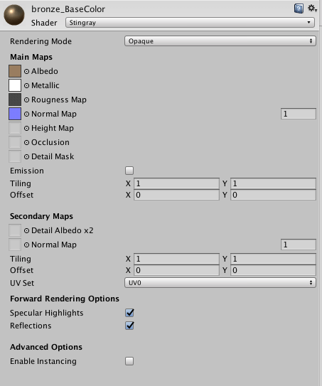 Stingray PBS具有与Unity标准着色 器相似的特性,因此我们创建了一个名为“Standard(Roughness setup)”的着色器。该着色器具有单独的粗糙度图,因此比Unity标准着色器消耗更多的图形资源。由于此原因,此着色器需要在前向渲染中使用着色器模型3.5。 我们建议在尽可能下使用标准着色器。