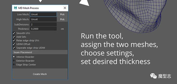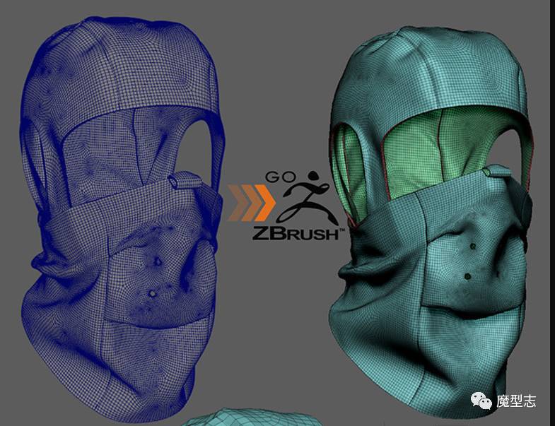把两个模型导入到Maya中,运行脚本,LowMesh就是四边面的低模。HighMesh就是三角面的高模,SubDivision就是细分等级,我觉得默认2级就哈了。然后可以设置Thinkness,模型的厚度,勾选选项基本是UV相关设置。点击Creat Mesh,你就得到下图左边的模型,接下来就可以去Zb玩耍了。
