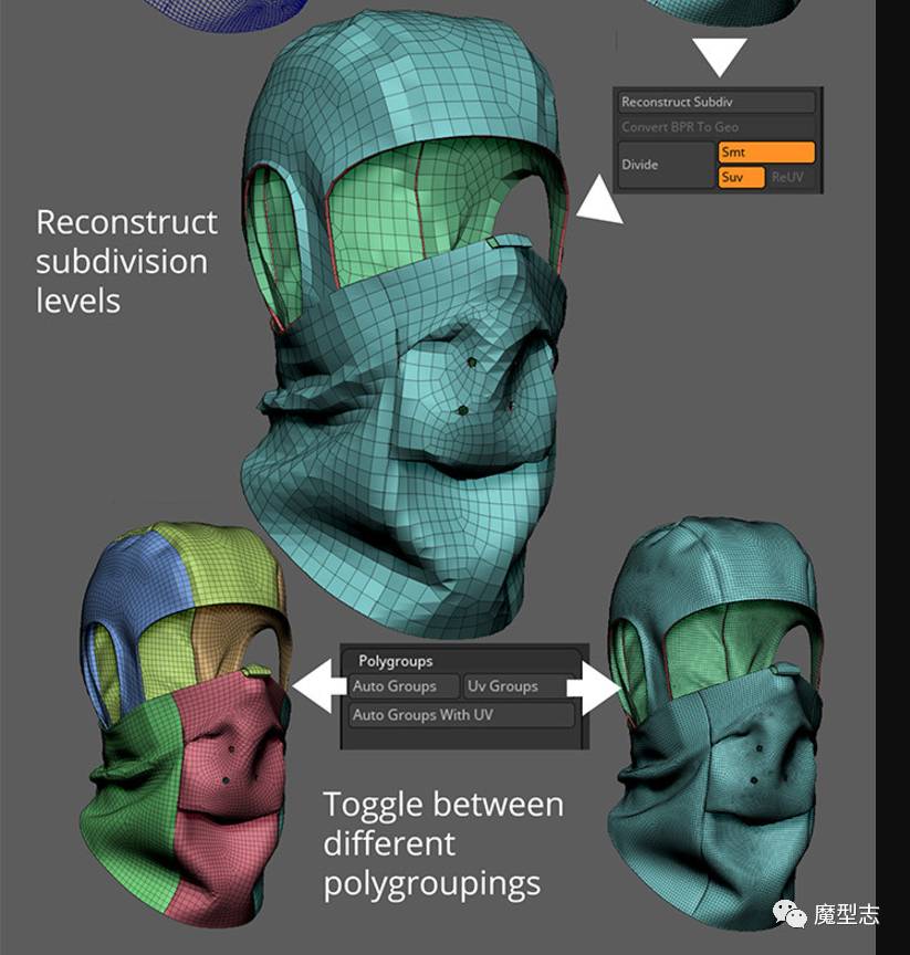 导入到ZBrush可以通过降级得到Level1的模型,然后在通过自动PolyCroup进行分组。这样在后期模型刷的过程中可以方便的细化每一部分。