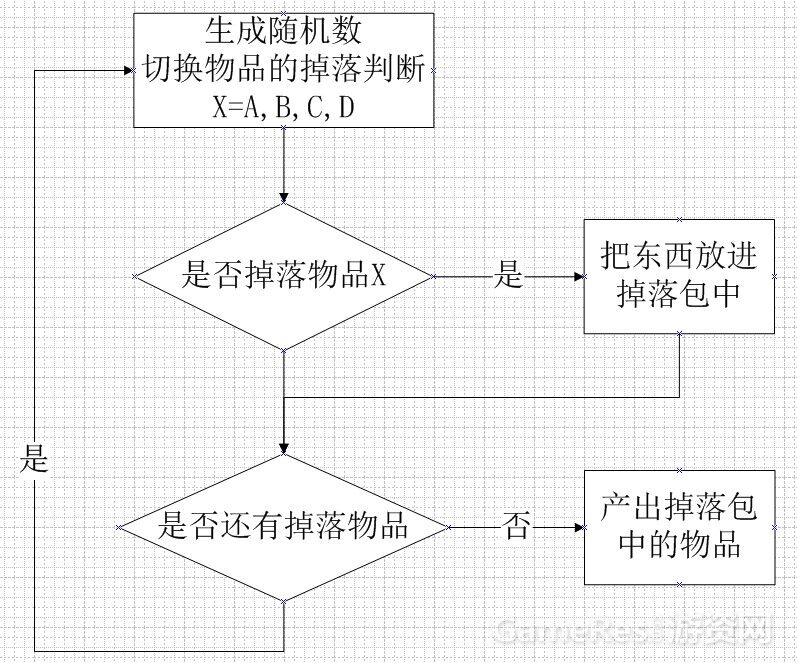 我们之前逐步掉落的方式的思路是这样的,循环判断每个道具的概率然后把他们放进一个掉落包中,然后掉落这个掉落包。