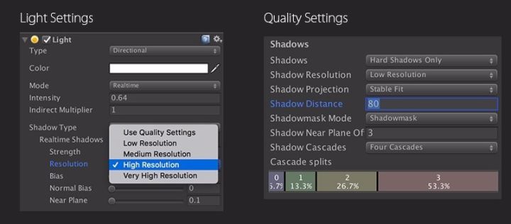 这样的修改,使得游戏从20-40FPS变化到60FPS。此外,移动设备也没有吃掉电池或变得超级热。在禁用实时阴影和使用假阴影之前,一开始我用调整阴影距离的方式提高了实时阴影的性能。只是最终我还是没有使用实时阴影。阴影距离可以帮助确保距离很远的对象没有阴影,使用质量设置中阴影的设置都可以对游戏效果和性能效果起到作用。