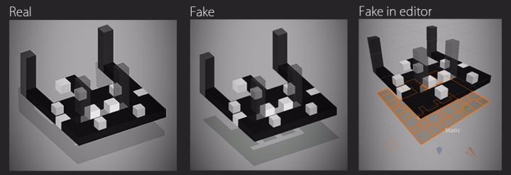 下图展示了实时阴影与假阴影的效果有多么的相似。但是从计算性能上则有了不少的提升。