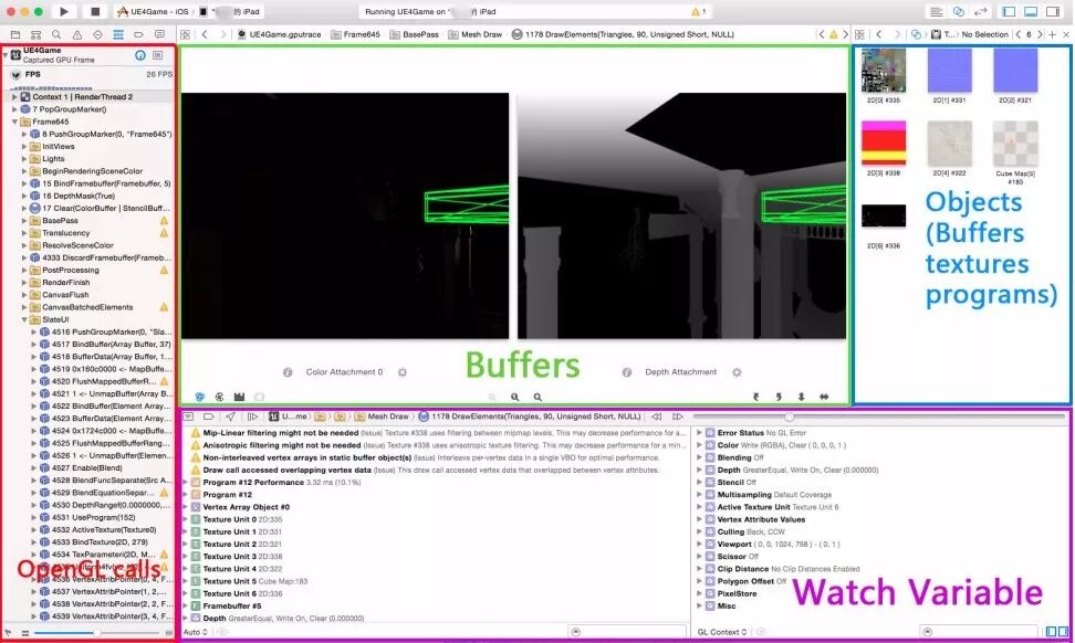 从XCode内启动游戏在真机运行,通过XCode内的Capture按钮可以抓取当前渲染帧的全部数据。界面左边展示了所有的Drawcall列表,中间上方是当前Drawcall渲染出的画面,下方是当前Drawcall的相关数据,右上方是当前Drawcall用到的纹理数据。这个工具可以显示每个Drawcall的耗时,因此可以用来检查哪些对象渲染耗时太高。进而分析是Shader原因,还是网格体太复杂等等。