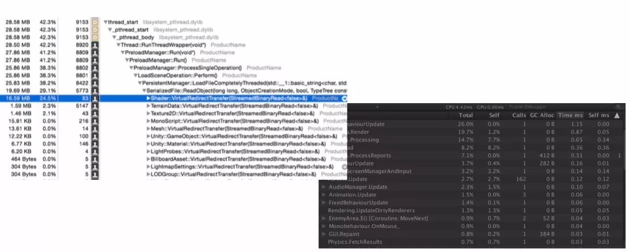 左上角是Instrument的Time Profiler工具,右下角是Unity Profiler,可以发现它们非常想像。区别在于Time Profiler可以分析一段时间范围内不同函数的时间消耗,而Unity Profiler只能分析一帧内代码的时间消耗。另外Time Profiler可以显示引擎底层耗时高的代码堆栈,非常方便从底层去理解性能问题的原因。Unity Profiler只能显示引擎代码中添加标签的函数耗时,因此往往在Instrument Time Profiler中可以看到更多有用的数据。