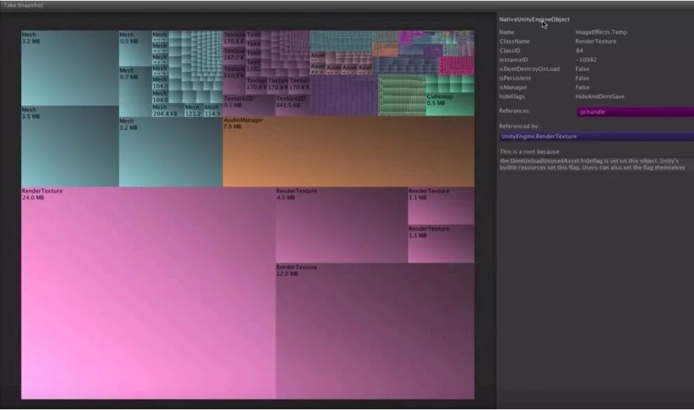 Unity为5.3以上的版本提供了一个新的Memory Profiler工具,这个工具目前还是以外部插件方式提供的。这个工具通过图形的方式展示了工程中占用内存最高的资源类型,因此可以很方便的进行资源内存的优化。另外还可以在游戏的不同时间点抓取多个快照,通过比较内存占用的不同,来发现某些资源内存泄漏的情况。